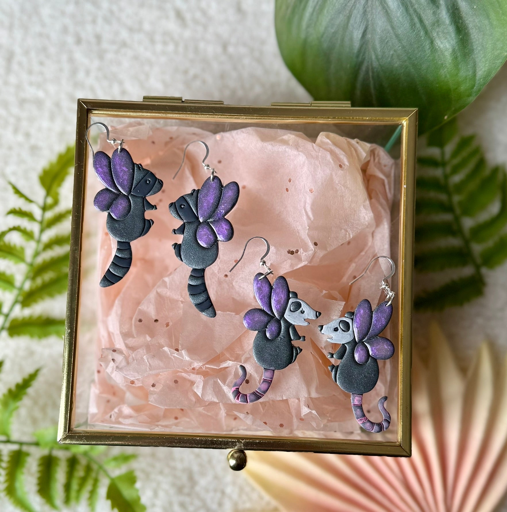 Add a touch of whimsy to your look with these Fairy Trash Mother Dangles—handmade polymer clay earrings featuring adorable opossums and raccoons sporting delicate fairy wings. Playful and unique, these charming earrings bring a fun, cute vibe to any outfit while showcasing your love for quirky, one-of-a-kind accessories. Perfect for those who appreciate a little magic and mischief in their style.